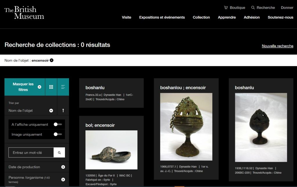 • BRITISH MUSEUM (Londres, UK) : Via via la nouvelle version de « Collection » en ligne, le musée offre plus de 300 items avec la recherche CENSER (encensoir) et plus de 1.200 avec INCENSE BURNER (bruleur d’encens). En jonglant avec les filtres associés, cela permet d’affiner la recherche.