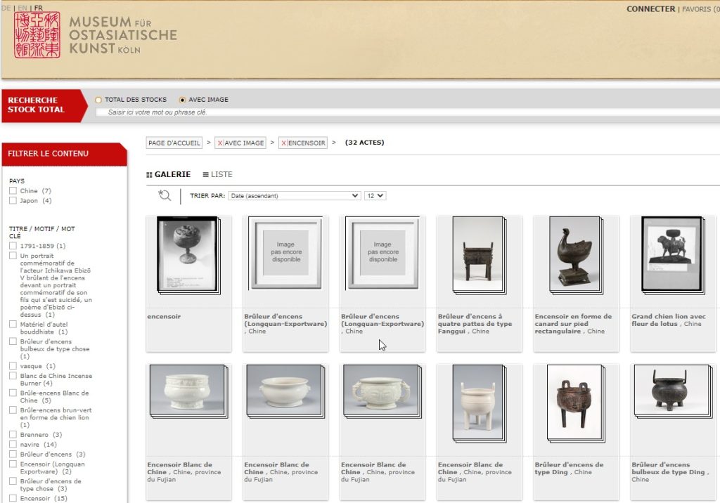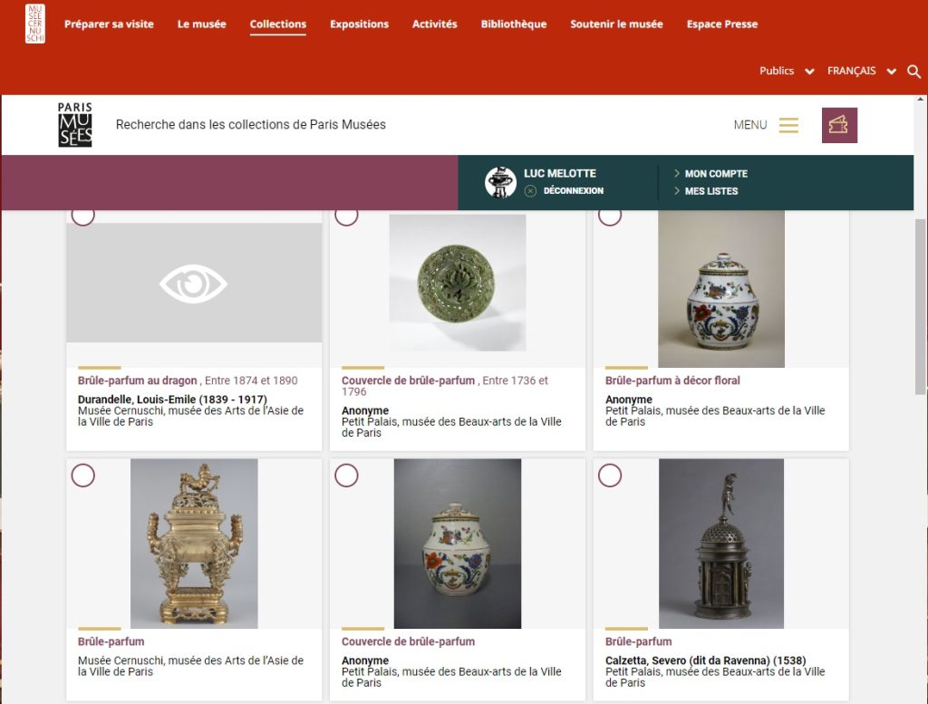 • Musée CERNUSCHI (Paris, FR) : L’outil de recherche proposé exploite les milliers d’œuvres proposés des quatorze musées de la ville de Paris. La recherche sur Brûle-parfum fournit plus de 6.400 résultats. Heureusement, les filtres associés sont disponibles pour réduire le nombre. En créant votre compte, vous pouvez créer vos propres listes et retourner à l’envie sur votre sélection. Remarquable outil de documentation !